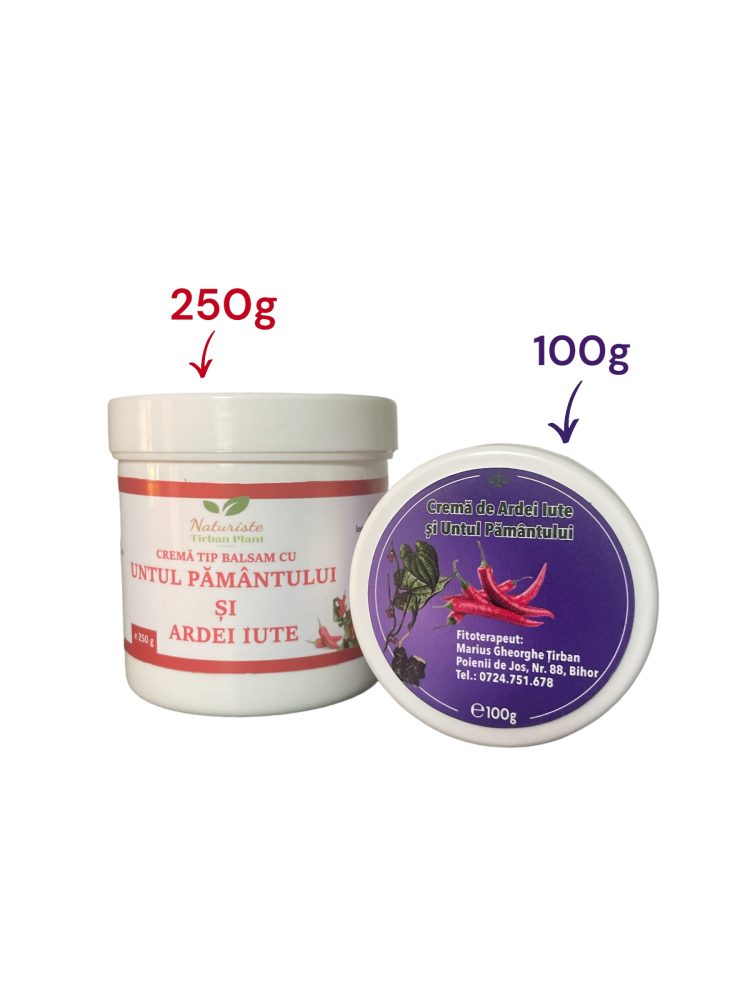 Această cremă combină puterea naturală a untului pământului și ardeiului iute, cu efecte remarcabile asupra durerilor reumatice și musculare. Formulată cu ulei vegetal, rășină de brad și ceară apicolă, este ideală pentru reducerea inflamațiilor și ameliorarea disconfortului articular și muscular.